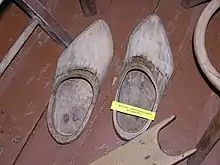 Дерев'янки — домашнє взуття з дерева, експонат музею історії Трускавця. (Des sabots, chaussures domestiques en bois, exposés au Musée d’Histoire de Truskavets.)