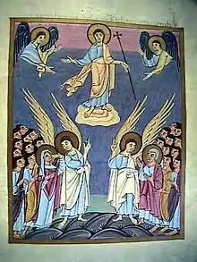 Сцена вознесения на небо, миниатюра из «Бамбергского Апокалипсиса», Scène de l'Ascension, miniature de l'Apocalypse de Bamberg.