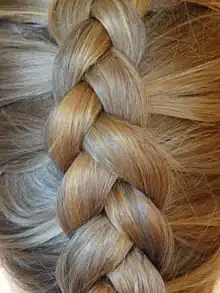 - (Coiffure) Tresse, natte. Au pluriel, prend plutôt le sens général de « cheveux ».