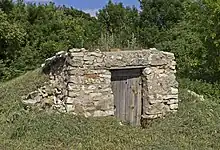 - (Architecture) Cave pour entreposer les provisions. Note : dans un pays où le permafrost empêche souvent de creuser la terre, ces caves sont souvent des édicules protégés du froid et de la chaleur par un tumulus de terre.