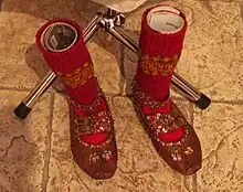 - (Habillement) Chaussures paysannes souples faites d'une pièce entière de cuir sans semelle cousue, qui étaient généralement portées par les jeunes enfants, attachées à leurs pieds avec des cordes.