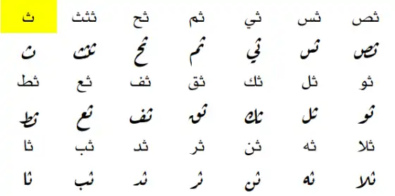 - Fricative interdentale sourde, correspondant au th anglais de thing, qui s'oppose au ذ (V) sonore. La prononciation varie suivant les régions, et peut dériver vers une articulation alvéolaire fricative ([z]), voire explosive ([d]) dans certaines régions du Maroc et de l'Algérie. Là où ث (F) se prononce [s], ذ (V) se prononce comme [zj, et là ث (F) se prononce [t], ذ (V) se prononce [d].