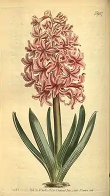 - Avec le sens de « fleur en épi », de l’arabe سنبل, sumbul (« épi ») présent dans سنبل هندي, sunbul hindiyy (« nard », littéralement « épi des Indes ») anglais spikenard, apparenté au kurde simbil (« épi, jacinthe ») ; plus avant d’un radical sémitique *s-b-l qui est dans shibboleth (« épi »).