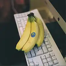 - Banane, fruit exotique comestible de forme oblongue, vert, puis jaune, puis tacheté à maturité.