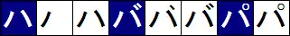 | ハ ha | ヒ hi | フ fu | ヘ he | ホ ho | ヒャ hya | ヒュ hyu | ヒョ hyo |