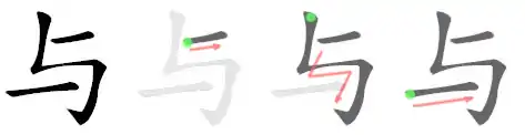 - Variante simplifiée de 與. Les graphies sur bronze suggèrent que le caractère d'origine serait plutôt 與 (voir ce caractère pour les formes anciennes), par la suite simplifié en 𢌱 puis 与 dans l'écriture sigillaire. De plus, dans cette composition sur bronze, 与 apparaît en réalité comme une déformation de l'élément 牙 (dents).