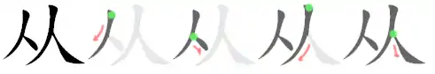 Tracé du caractère - Un homme (人) qui marche à la suite d'un autre homme (人), dans le même sens (c'est l'opposé de 北).
