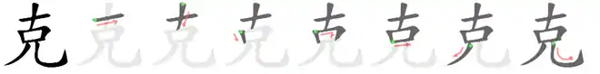 - Le caractère signifie primitivement : Être capable de / Se préparer à / L'emporter. Le lien avec le graphisme n'est pas clair, et fait l'objet d'interprétations variées. On peut voir dans le dessin oraculaire un personnage en train de courir les deux mains levées, peut-être en signe de victoire, peut-être pour se désigner comme champion.