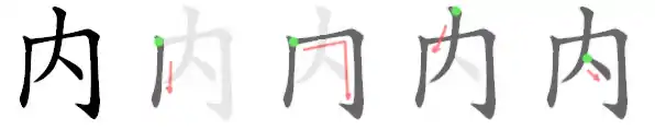 - Ensuite, dans les graphies sigillaires, l’homme a été réinterprété comme une racine (入) rentrant à l’intérieur d’un espace (冂). Le caractère prend un sens dynamique : rentrer à l’intérieur, entrer. Cette étymologie a conduit à la forme graphique traditionnelle 內, en réalité fautive par rapport à l’étymologie, et à la classification du caractère traditionnel sous la clef 入.