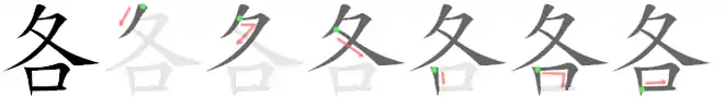 À droite : 佫, 咯, 垎, 峈, 恪, 挌, 洛, 狢, 络, 饹, 骆, 格, 烙, 珞, 胳, 赂, 辂, 略, 硌, 袼, 铬, 絡, 臵, 蛒, 衉, 嗠, 觡, 詻, 貉, 賂, 路, 輅, 酪, 鉻, 餎, 駱, 骼, 鮥, 鴼
