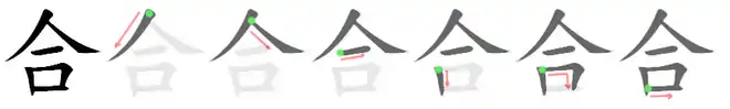 - Composés de 合 dans le ShuoWen : 𧊧, 給, 姶, 拾, 閤, 龕, 洽, 恰, 匌, 頜, 欱, 袷, 佮, 郃, 㭘, 䶀, 鴿, 翕, 㪉, 鞈, 弇, 詥, 跲, 䢔, 荅, 祫