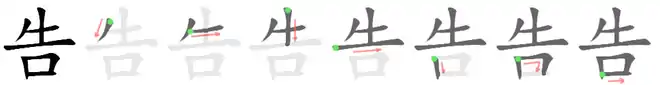 - Composés de 告 dans le ShuoWen : 酷, 靠, 浩, 焅, 硞, 峼, 窖, 晧, 郜, 梏, 鵠, 誥, 造, 牿, 祰