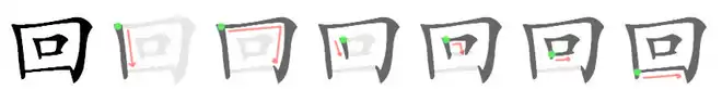 Tracé du caractère - Le caractère représente à l'origine une spirale, traduisant l'idée de tourner en rond. Le tracé classique a évolué en 囘, mais très tôt le caractère s'est simplifié en des cercles concentriques pour donner la forme moderne.