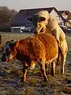 - Pour Wieger, il s'agit simplement celle qui fait la symétrie (匕) avec le taureau (牛). En réalité, il s'agit plus précisément ce celle qui se présente au taureau (牛) en se retournant (匕), donc : la vache, sa femelle.