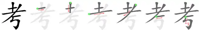 Tracé du caractère - Un vieillard (老 simplifié en 耂) qui a du mal à respirer (丂) parce qu'il a de l'asthme : un vieil asthmatique.