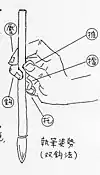 Tracé du caractère - Ce peut être la main en train de tracer une ligne d’écriture (一 en bas) sur une feuille de papier (冂 ou 卩, simplifié en 一 supérieur), ou sur une latte de bambou.
