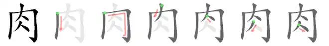 Tracé du caractère - L'image d'origine (que l'on retrouve dans 胾 Viande hachée) montre un morceau de viande où l'on devine les côtes, des côtelettes. La composition ayant évolué, le caractère a été réinterprété comme : Lanières (仌) de viande séchée, réunies en paquet (勹). En position de clef, 肉 s'écrivait autrefois ⺼ pour prendre aujourd'hui la forme de 月, identique à celle de la lune.