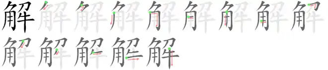 - Eumhun : 벗을 개, 풀 개, 헤칠 개, 발신할 개, 쪼갤 해, 꺠우칠 해, 풀 해, 괘 이름 해, 벗을 해
