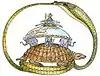 - Alternativement, le tableau évoque probablement en amont la tortue mythologique 賁, grande tortue à trois pattes, dont la carapace serait recouverte (ornée) de coquillages et d'algues. Ce contexte marin s'accorde mieux aux dérivés se rattachant à l'idée de souffler (噴, 歕, 濆), comme une baleine par son évent.