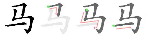 À gauche : 驭, 驮, 驯, 驰, 驱, 驲, 驳, 驴, 驵, 驶, 驷, 驸, 驹, 驺, 驻, 驼, 骀, 驿, 骁, 骃, 骄, 骅, 骆, 骇, 骈, 骊, 骋, 验, 骍, 骎, 骏, 骐, 骑, 骓, 骔, 骕, 骖, 骒, 骗, 骙, 骚, 骝, 骟, 骠, 骡, 骢, 骣, 骤, 骥, 骦, 骧