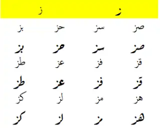 ز (z) /z/ ; isolée ز, initiale زلل, médiane لزل, finale للز