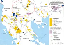 Répartition géographique des Aroumains (en orange, carte de 2001)