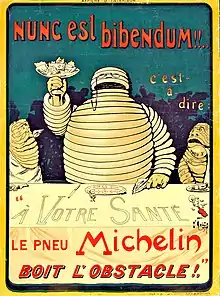 - Ce nom vient du slogan en latin nunc est bibendum (maintenant, il est temps de boire), ce personnage étant représenté sur la première affiche de Michelin buvant un verre rempli de morceaux de verre susceptibles de provoquer des crevaisons, et le mot étant réinterprété via le slogan Le pneu Michelin boit l’obstacle.