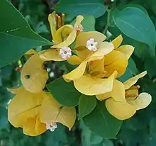 Bougainvillea glabra aux bractées jaunes, en leur centre on aperçoit les fleurs.