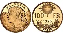 Pièce de monnaie suisse avec mention du pays en latin (HELVETIA).
