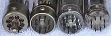 Elektrische Durchführungen an der Unterseite von Vakuumröhren, wessen Hermetizität kritisch für deren Zuverlässigkeit ist – Passages électriques dans la face inférieure de tubes à vide, dont l’herméticité (sens 1) est critique pour la fiabilité.