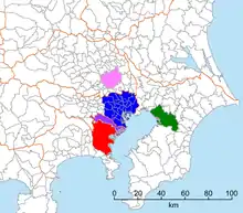 Localisation de la ville de Kawasaki (violet) dans la préfecture de Kanagawa.