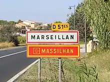 Panneau d’entrée bilingue (français et occitan) de Marseillan (Hérault).