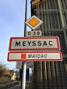 Panneau d'agglomération de Meyssac.
