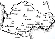 - (Géographie) Région où est parlé l’occitan, principalement le sud de la France, à savoir le Limousin, l’Auvergne, la Gascogne, le Languedoc, la Provence et le Dauphiné.