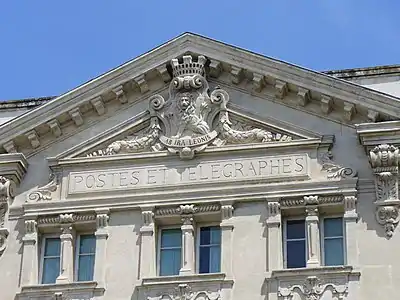 Façade de l’ancienne poste d’Arles portant l’inscription POSTES ET TELEGRAPHES.