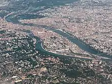 Vue aérienne de la Presqu’île de Lyon depuis le sud.