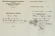 - (Éducation) Certificat de maturité, diplôme de baccalauréat ; synonyme en Allemagne et d’autres régions (avec Abiturzeugnis) de Maturazeugnis, cf. pour autres informations. Note : Dans les documents officiels, on trouve aussi la locution Zeugnis der Reife, littéralement « certificat de maturité », comme le montre l’illustration.