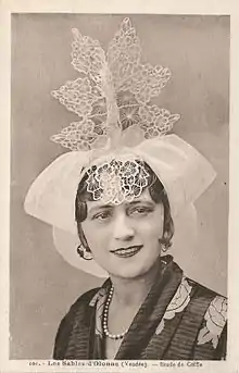 — (G. Lagneau, Recherches comparatives sur la menstruation en France, dans Bulletins et mémoires de la Société d'anthropologie de Paris, séance du 21 décembre 1865, Paris : chez Victor Masson, 1865, volume 5, page 730)On croisait des Sablaises en costume traditionnel : jupes noires courtes et plissées, corsages à manches bouffantes, coiffes de dentelle aériennes dites « papillon ».