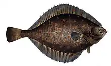 - (Ichtyologie) Carrelet, plie, poisson plat de l'espèce (Pleuronectes platessa).
