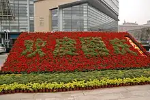欢度国庆, célébration de la fête nationale chinoise en 2009, écrit dans un parterre de fleurs.