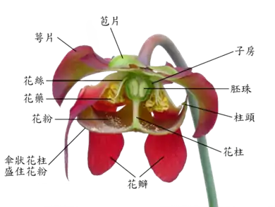 - 傘狀花柱盛住花粉 (sǎnzhuàng huāzhù shèngzhù huāfěn) — pistil profilé comme un parapluie attrapant le pollen