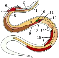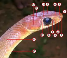 Anatomie d’un serpent 1: œsophage, 2: trachée, 3: poumon trachéen, 4: poumon gauche, 5: poumon droit, 6: cœur, 7: foie, 8: estomac, 9: sac aérien, 10: vésicule biliaire, 11: pancréas, 12: rate, 13: intestin, 14: testicules, 15: rein.
