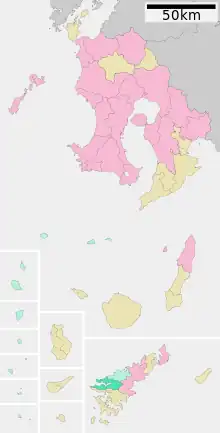 Localisation d’Uken-son au sein de la préfecture de Kagoshima (en vert vif).