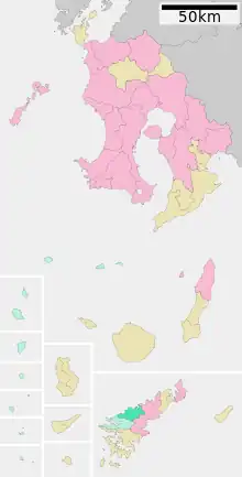 Localisation de Yamato-son au sein de la préfecture de Kagoshima (en vert vif).