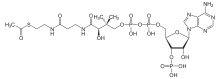 Acétyl-CoA. La partie propre à la coenzyme A peut être déduite par comparaison avec la figure ci-dessous, comme étant toute celle qui est à droite de l'atome de soufre (-S-), incluant ce dernier.