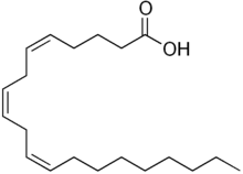 - (Biochimie) (Indénombrable) Acide gras insaturé à 20 atomes de carbone possédant trois double liaisons cis ; sa formule chimique est C20H34H2.