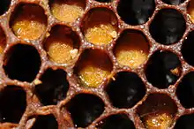 - (En particulier) Cellule de forme hexagonale où les abeilles déposent leurs œufs, leur miel, du pollen.