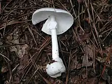 - (Mycologie) Espèce de champignons à lames, à volve et à anneau, entièrement blanc.