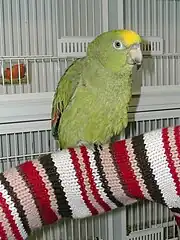 amazone à front jaune \a.ma.zo.n‿a fʁɔ̃ ʒon\ masculin ou féminin (l’usage hésite)