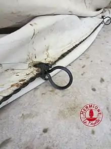 - (Marine) (Vieilli) Petit anneau disposé sur la ralingue des voiles triangulaires.